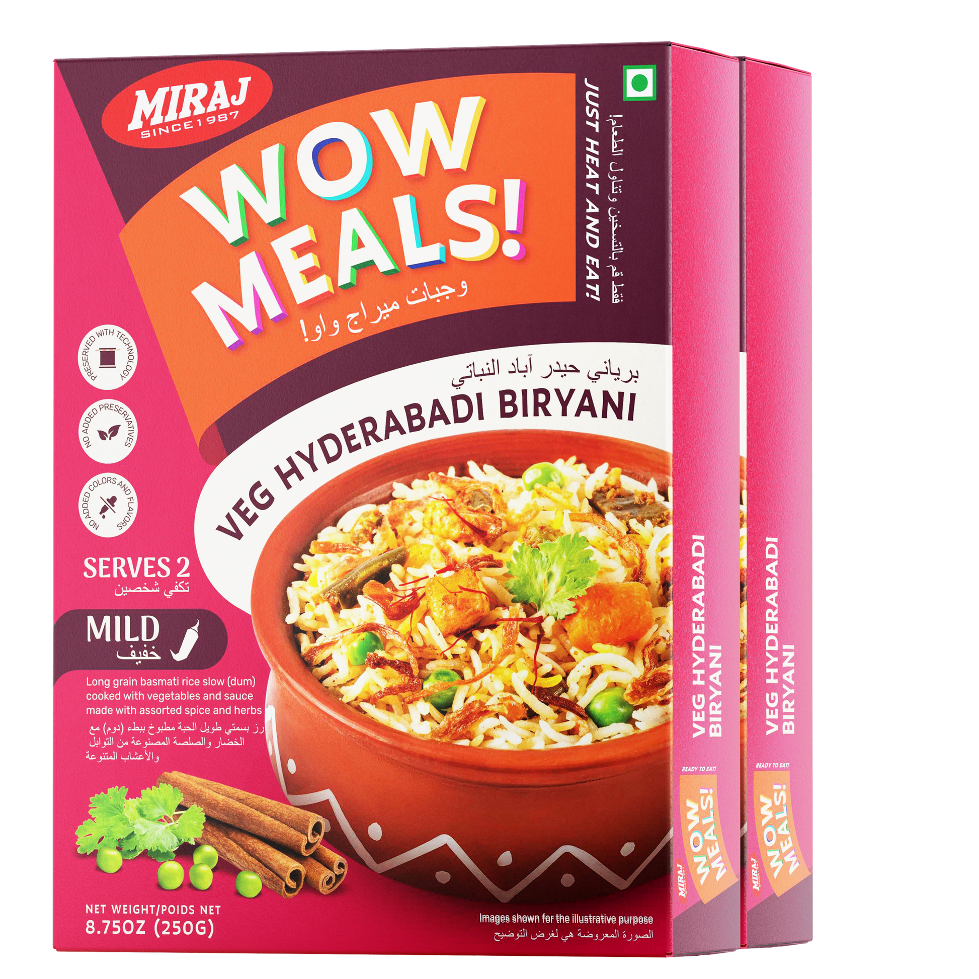 Enjoy the royal flavors of Hyderabad anywhere, anytime with Miraj WOW Meals Ready to Eat Veg Hyderabadi Biryani. Prepared with premium long-grain Basmati rice, fresh vegetables, curd, and a rich blend of authentic spices, this biryani is cooked in the traditional dum style for unmatched taste and aroma.